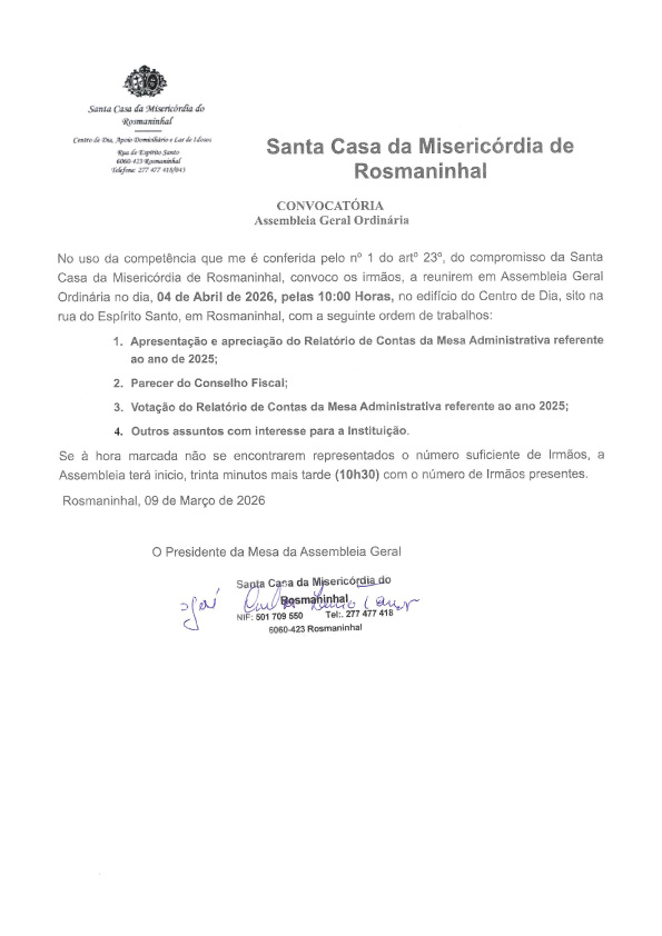Convocatória para uma Assembleia Geral Ordinária da Santa Casa da Misericórdia do Rosmaninhal, no dia 04 de abril de 2026, pelas 10h00, no Edifício do Centro de Dia, na Rua do Espírito Santo, Rosmaninhal, com a seguinte ordem de trabalhos: